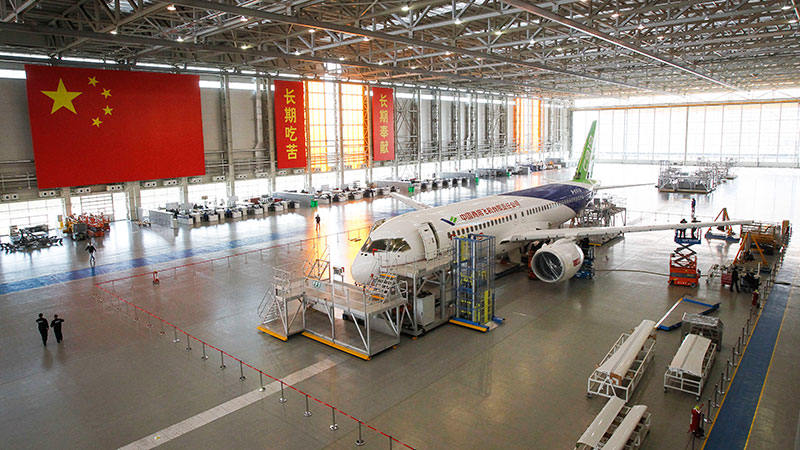 4/5 2015年12月8日,上海祝桥镇,中国商飞总装制造基地,工人正在国产大飞机C919车间内检查装配。 澎湃资料图