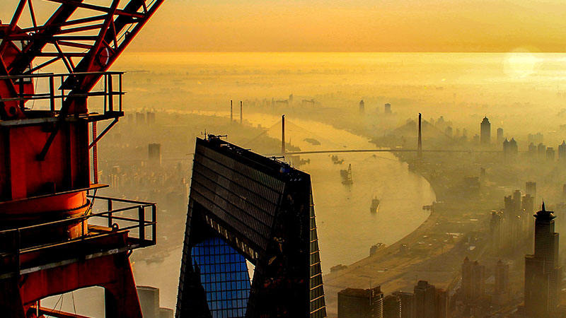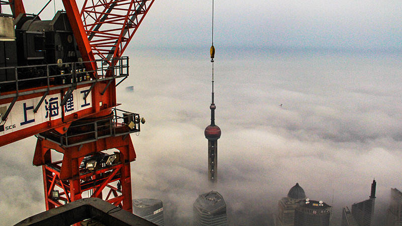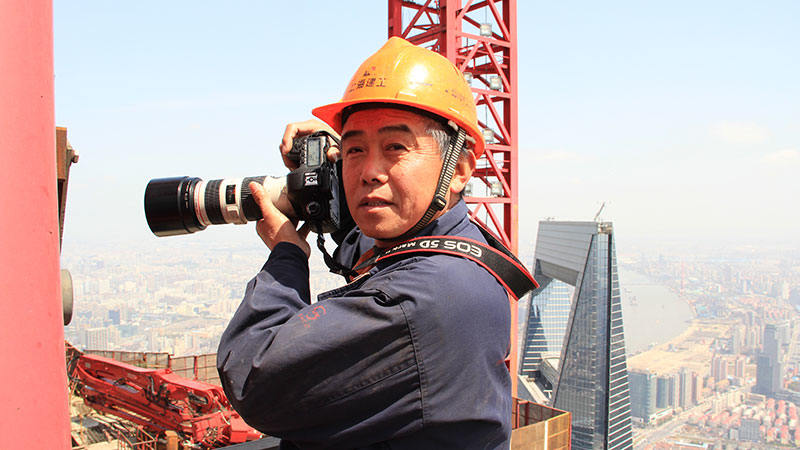 我也是个摄影爱好者,媒体称我是“最高”的摄影师。站在200米以上,云很低的时候,像雾一样飘,人就像踏在天上。工作之余,我用相机拍下了上海的高空之美,捕捉过塔吊倒映在云上的影子。