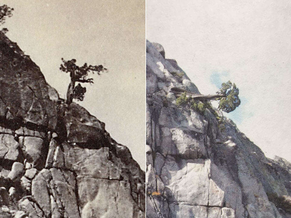当年CP的摄影师在此拍摄了多张老照片,在华工建造的隧道上方,百年来一直挺立着一棵松树,如今它却垂下了90度,就像在给华工鞠躬致敬一样。